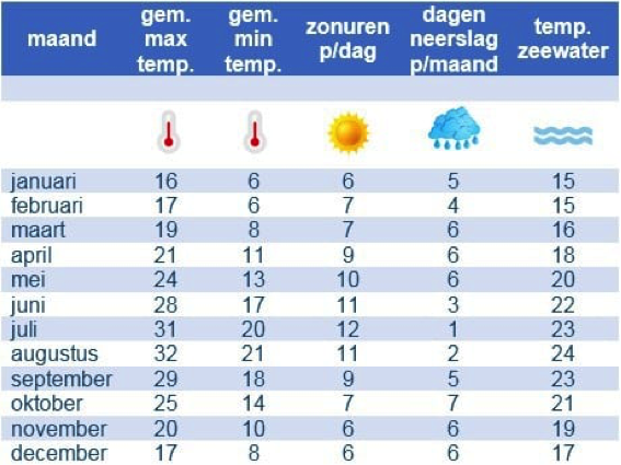 In de lentemaanden maart, april en mei is het al tussen de 18 en 24 graden Celsius warm. De zee is dan uiteraard wel nog iets koeler met een gemiddelde van 15 graden Celsius.