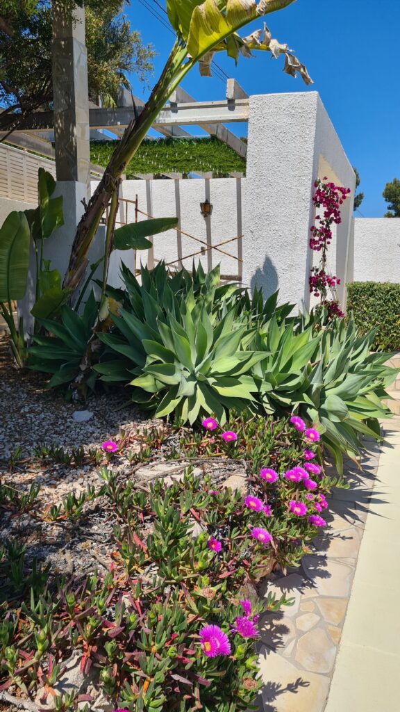 De mediterraanse tuin is een verzameling van zuiderse planten zoals palmen en olijfbomen, terwijl de bloemrijke hortensia’s en bougainvillea’s een groot deel van het zonrijke jaar hieraan veel kleur toevoegen.